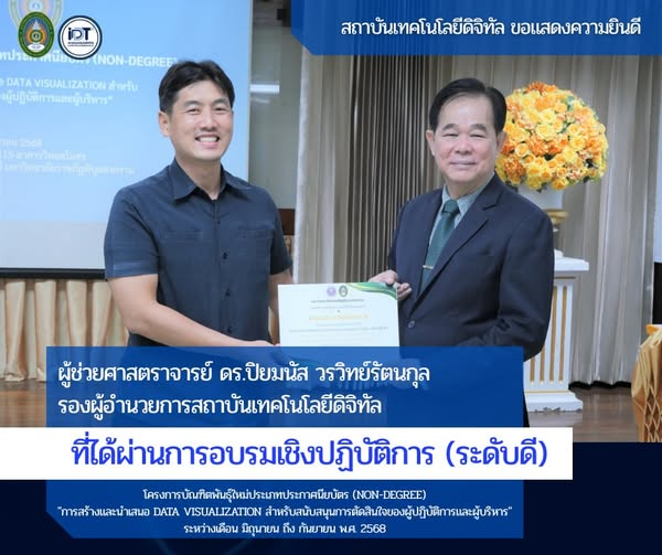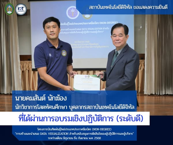 บุคลากรสถาบันเทคโนโลยีดิจิทัล ผ่านการอบรมเชิงปฏิบัติการ (ระดับดี) โครงการบัณฑิตพันธุ์ใหม่ประเภทประกาศนียบัตร (NON-DEGREE) “การสร้างและนำเสนอ DATA VISUALIZATION สำหรับสนับสนุนการตัดสินใจของผู้ปฏิบัติการและผู้บริหาร”