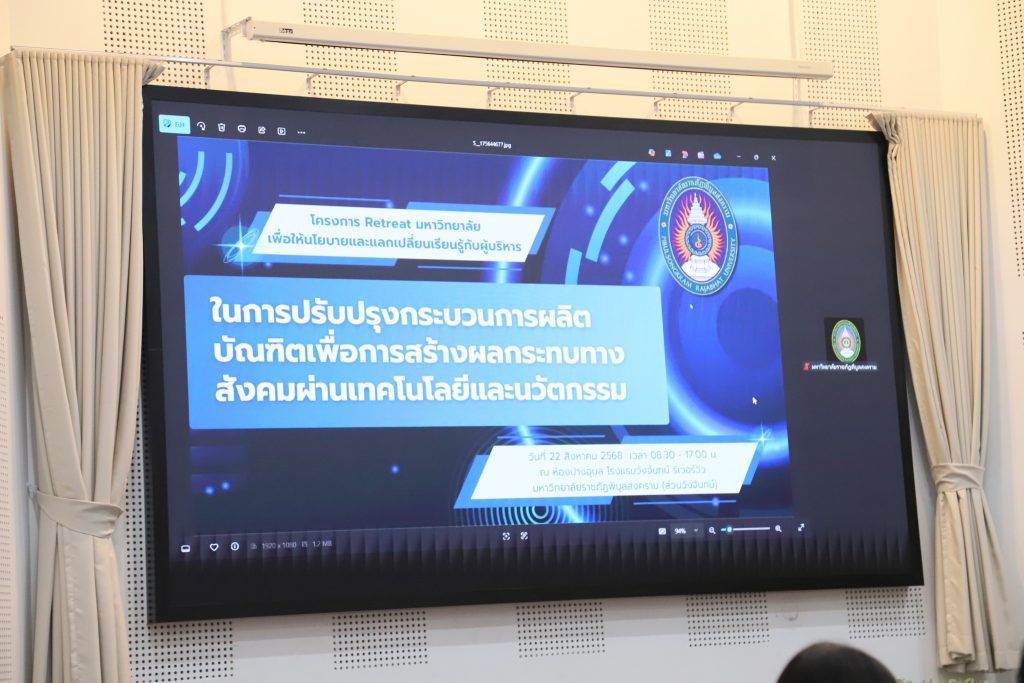 ร่วมการประชุม Retreat มหาวิทยาลัยเพื่อให้นโยบายและแลกเปลี่ยนเรียนรู้กับวิหารในการปรับปรุงกระบวนการผลิตบัณฑิตเพื่อการสร้างผลกระทบทางสังคมผ่านเทคโนโลยีและนวัตกรรม เป็นการนำข้อมูลประกอบการพิจารณาเพื่อใช้ในการระดมสมองการจัดทำแผนยุทธศาสตร์การพัฒนามหาวิทยาลัยราชภัฎพิฏพิบูลสงคราม ระยะ 5 ปี (พ.ศ. 2570 – 2574 )