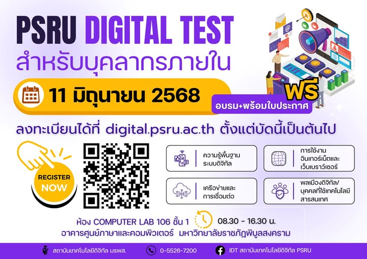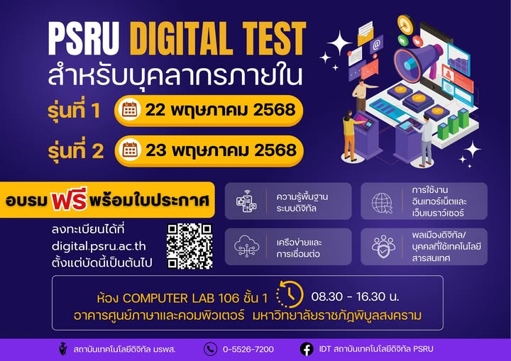 ข่าวประกาศ ขอเชิญบุคลากรทุกท่านเข้าร่วมการอบรม PSRU DIGITAL TEST วันที่ 11 มิถุนายน 256822 กันยายน 202522 กันยายน 2025
