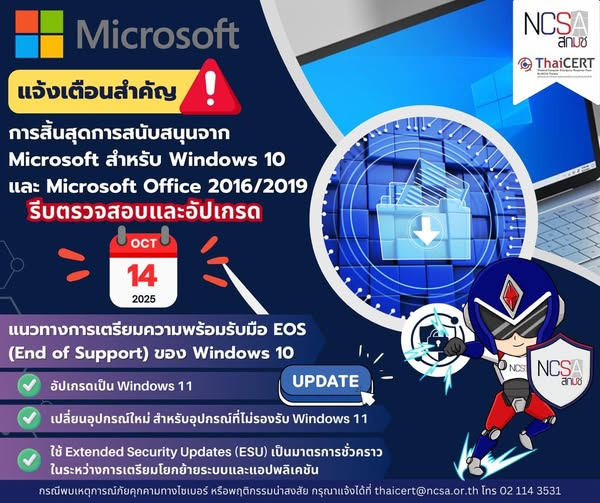 ข่าวประกาศ แจ้งเตือน: การสิ้นสุดการสนับสนุน Windows 10 และ Microsoft Office 2016/2019 ในวันที่ 14 ตุลาคม 256822 กันยายน 202522 กันยายน 2025