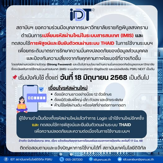 ข่าวประกาศ ขอความร่วมมือบุคลากร มรพส. ดำเนินการเปลี่ยนรหัสผ่านใหม่ในระบบสารสนเทศ (IMIS) และทดสอบใช้การพิสูจน์และยืนยันตัวตนผ่านระบบ THAID22 กันยายน 202522 กันยายน 2025