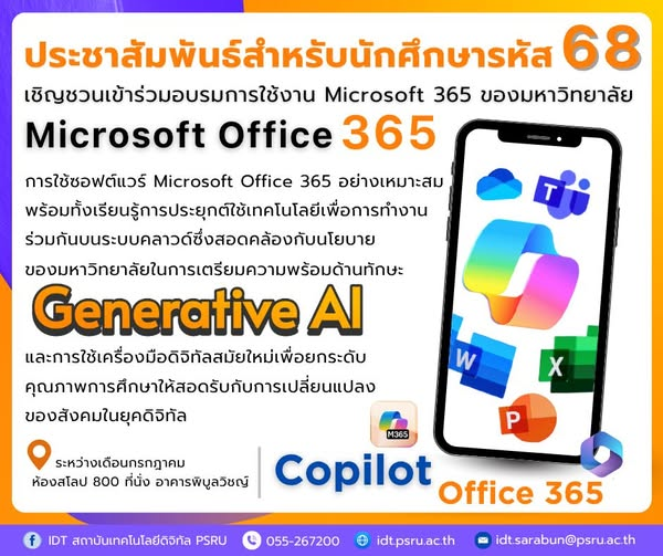 ข่าวประกาศ ขอเชิญชวนน้องๆ นักศึกษาใหม่ รหัส 68 เข้าร่วมอบรมการใช้งาน Microsoft Office 365 และเรียนรู้การประยุกต์ใช้ Generative AI พร้อม Copilot เพื่อเพิ่มทักษะและยกระดับคุณภาพการศึกษาให้ทันสมัยในยุคดิจิทัล22 กันยายน 202522 กันยายน 2025