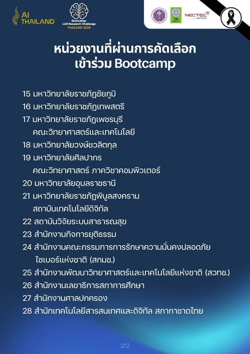 ข่าวประกาศ หน่วยงานที่ผ่านการคัดเลือกเข้าร่วม #BootcampLLM จำนวน 28 หน่วยงาน23 ธันวาคม 202523 ธันวาคม 2025